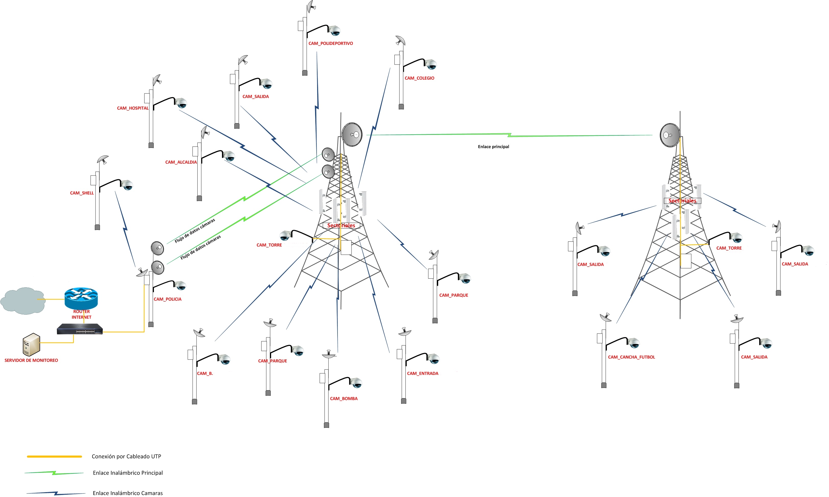 Se realizó el montaje de soportes en postes de 12 Mts, instalación de cámaras Axys y enlaces de interconexión, todo centralizado en el cuarto de monitoreo principal. Tiempo de ejecución (1 Año)